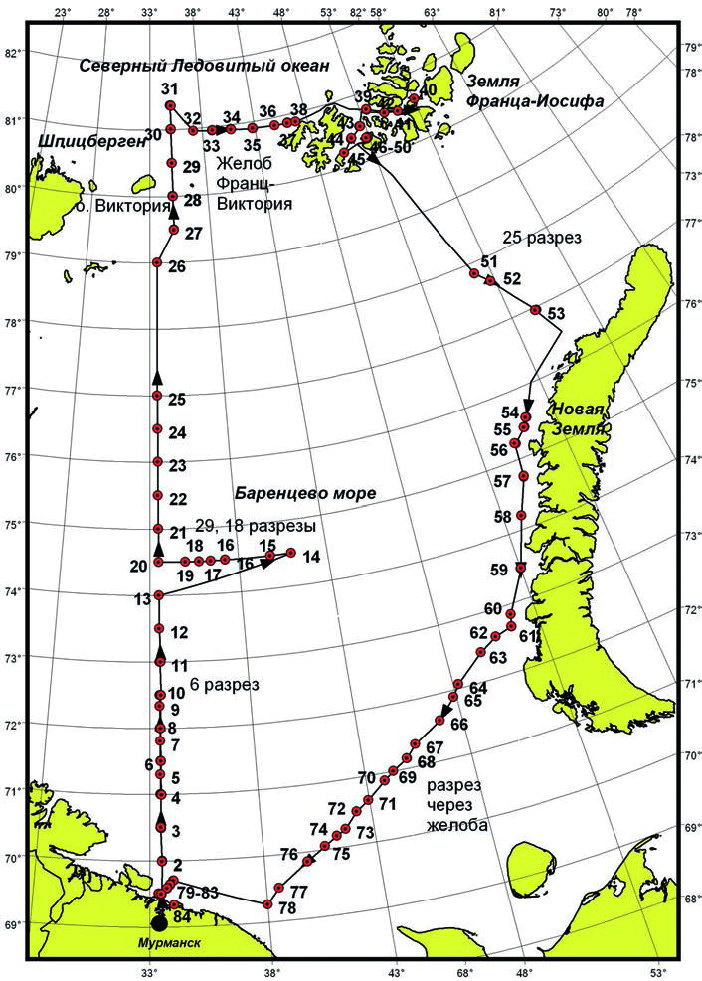 На разрезе «Кольский меридиан» отмечены большие положительные значения аномалии температуры воды. В северной части разреза наблюдался мощный заток атлантических вод, выраженный и в положительных значениях аномалий солености воды. Зарегистрирован значительный заток вод атлантического происхождения через желоб Франц-Виктория.