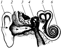 Рис. 2. Органы слуха: 1 – ушная раковина; 2 – наружный слуховой проход; 3 – барабанная перепонка; 4 – слуховые косточки; 5 – полулунные каналы; 6 – улитка