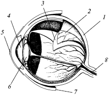 Рис. 3. Строение глаза: 1 – белочная оболочка; 2 – сосудистая оболочка; 3 – сетчатка; 4 – радужная оболочка; 5 – роговица; 6 – хрусталик; 7 – мышца; 8 – зрительный нерв