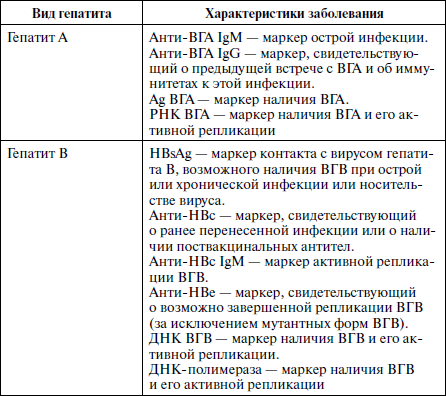 Диагностика вирусного гепатита основывается на клинических, эпидемиологических и лабораторных данных. Решающее значение в расшифровке этиологии заболевания и прогнозе течения болезни принадлежит серологической диагностике. Основные диагностические маркеры вирусных гепатитов различной этиологии представлены в табл. 1.