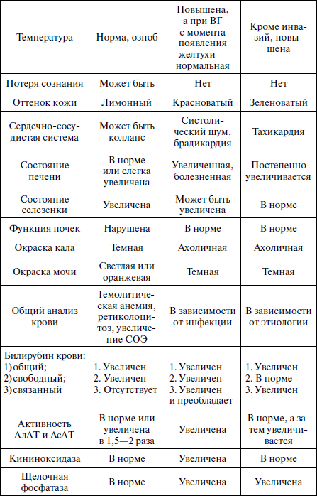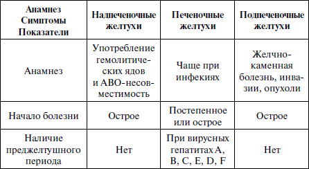 В желтушном периоде прежде всего необходимо решить вопрос, с каким видом желтухи вы имеете дело: с печеночной, надпеченочной или подпеченочной (табл. 2).