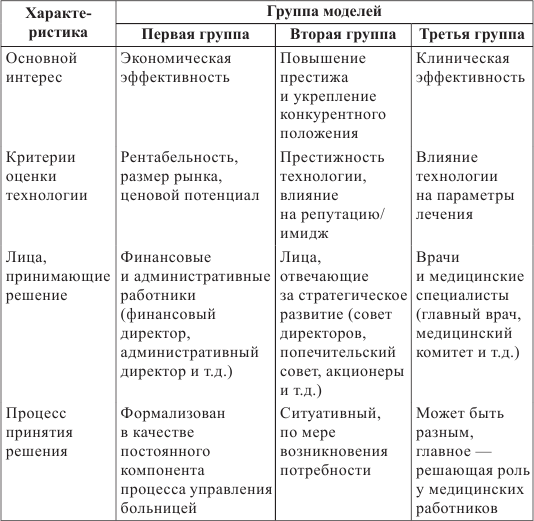 Эффективная государственная политика в сфере поддержки внедрения медицинских технологий невозможна без понимания поведения ключевых субъектов, вовлеченных в процесс принятия решений о внедрении новых технологий, а именно – медицинских организаций. В литературе выделяются три основные группы моделей, описывающих интересы и процесс принятия решений в отношении внедрения новых технологий в больницах. Это модели принятия финансово-экономических решений (первая группа), стратегически-институциональных решений (вторая группа) и медико-технологических решений (третья группа). В табл. 1.9 систематизированы основные отличия данных групп.