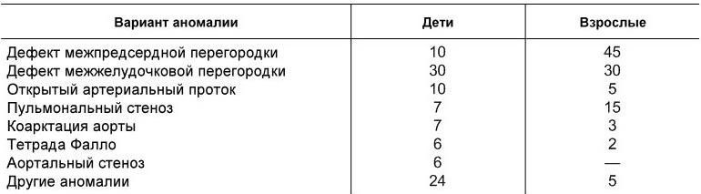 Большинство из этих нарушений могут быть выявлены уже в раннем детском возрасте. Однако клинические проявления некоторых дефектов развития могут формироваться во взрослом возрасте (кальциноз бикуспидального аортального клапана, выраженный митральный пролапс). Истинная частота врожденных аномалий развития сердца у взрослых не известна. Но она существенно отличается от таковой у детей (табл. 1.18), поскольку большинство детей с врожденными пороками переносят радикальные операции, часть детей с неустраненными пороками умирают и, наконец, некоторые врожденные аномалии (дефект межпредсердной перегородки) могут спонтанно излечиваться.