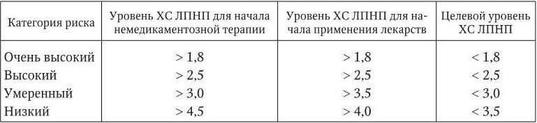 Уровни ХС ЛПНП для определения тактики лечения больных и целевые уровни ХС ЛПНП в зависимости от категории риска (ммоль/л)