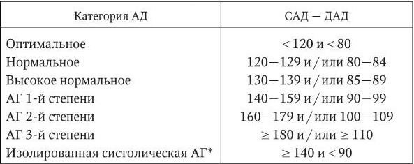 *Изолированная систолическая АГ должна классифицироваться на 1-ю, 2-ю, 3-ю степень согласно уровню систолического АД.