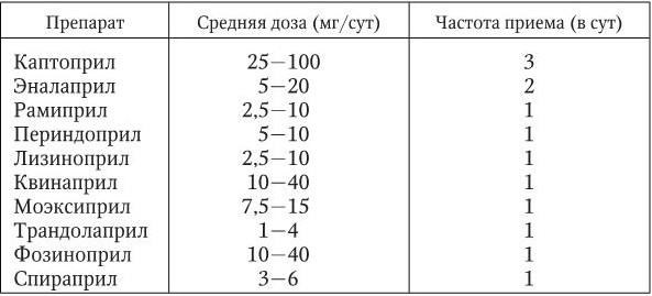 Средние дозы и частота приема ингибиторов АПФ, наиболее широко применяемых для лечения больных АГ