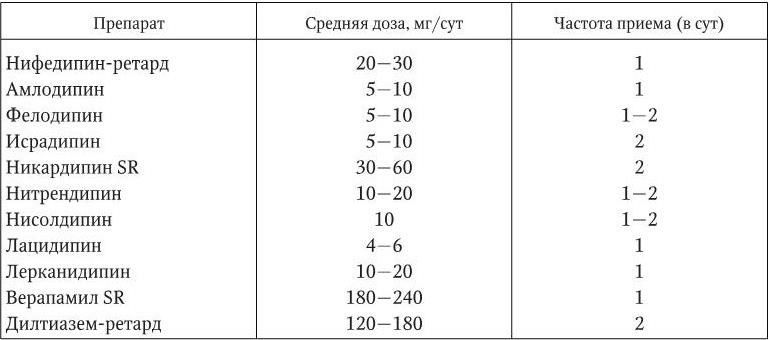Средние дозы и кратность приема антагонистов кальция, наиболее широко применяемых в терапии АГ, указаны в табл. 1.16.