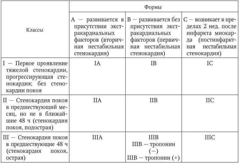 Нестабильная стенокардия – это синдром, обусловленный обострением ИБС, который характеризуется высоким риском развития ИМ и внезапной смерти. В соответствии с Рабочей классификацией ИБС выделяют следующие клинические варианты нестабильной стенокардии: впервые возникшая стенокардия (напряжения или покоя, прогрессирующая или непрогрессирующая) в течение предшествующих 4 нед.; прогрессирующая стенокардия после периода стабильного течения; ранняя постинфарктная или послеоперационная стенокардия. C. W. Hamm и E. Braunwald в 2000 г. предложили классификацию нестабильной стенокардии, в которой учитываются характер и изменение частоты возникновения ангинозных болей, их связь с физической нагрузкой и экстракардиальными факторами, усиливающими ишемию миокарда (табл. 1.19).