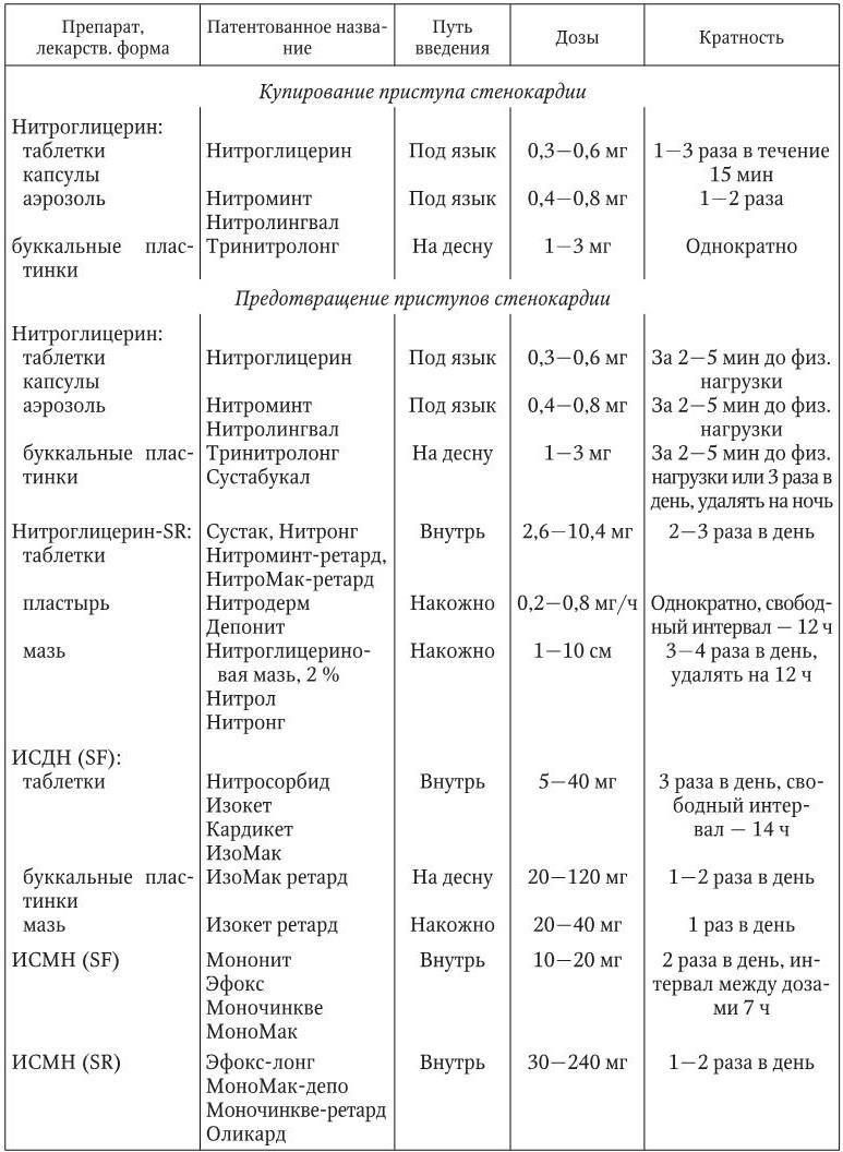 Нитроглицерин в виде таблеток, масляного раствора в желатиновых капсулах и аэрозолей применяется сублингвально для купирования приступов стенокардии. Продолжительность эффекта составляет 15 – 20 мин. Пролонгированные формы нитроглицерина, предназначенные для приема внутрь, оказывают более длительное антиангинальное действие – до 4 ч, но вследствие интенсивного метаболизма в печени характеризуются плохо предсказуемым клиническим эффектом и в настоящее время для лечения больных стенокардией не рекомендуются. Накожное применение нитроглицерина в виде мази или пластыря предотвращает его разрушение при первом прохождении через печень. Однако регулярное применение трансдермальных форм вызывает быстрое развитие толерантности к нитратам. Изосорбида динитрат непролонгированного действия применяется как для купирования (сублингвально), так и для предотвращения (внутрь) приступов стенокардии. Кратность приема пролонгированных форм в зависимости от дозы составляет 2 – 3 раза в сутки. Изосорбида динитрат по сравнению с нитроглицерином обладает большей биодоступностью, но уровень его активных метаболитов в крови подвержен значительным колебаниям в зависимости от функционального состояния печени. Изосорбида-5-мононитрат применяется внутрь для профилактики приступов стенокардии. Соединение не метаболизируется в печени и обладает 100 % биодоступностью. В связи с длительным периодом полувыведения обычные препараты изосорбида-5-мононитрата применяются 2 раза в сутки, пролонгированные – 1 раз в сутки. При стенокардии I – II функционального класса рекомендуется применять главным образом нитраты короткого действия перед предполагаемой физической нагрузкой. При стенокардии III – IV функционального класса нитраты в виде лекарственных форм длительного действия применяются постоянно по асимметричной схеме (табл. 1.21).