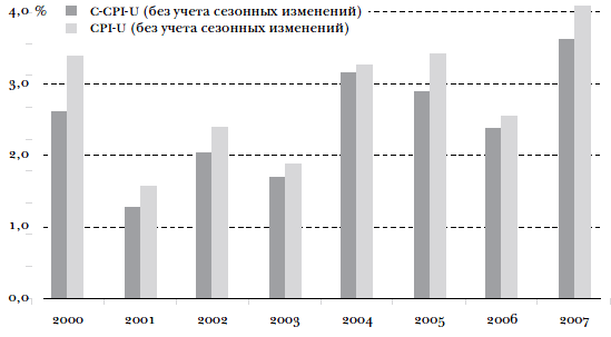 Бюро статистики труда (БСТ) – учреждение Министерства труда, ответственное за вычисление и распространение СPI, – добилось серьезных успехов в совершенствовании этого индекса. Если бы современные методы использовались и раньше, то показатели инфляции, связанные с CPI, снизились бы на 43 базисных пункта в год (по данным исследований БСТ). Некоторые из усовершенствований осуществляются; другие были произведены или ускорены после издания работы «К более точному измерению стоимости жизни» [Boskin et al., 1996]. В этом докладе мы с коллегами оценили, что наблюдавшееся в то время изменение CPI, которое принималось за измерение индекса реальной стоимости жизни[49], в течение достаточно долгого срока завышало показатель инфляции примерно на один процентный пункт в год. Разумеется, наши оценки тоже делались с некоторым разбросом; возможно, это завышение было чуть больше или чуть меньше. С того времени БСТ приняло ряд серьезных усовершенствований, несколько уменьшивших эту системную ошибку, однако, согласно последующим расчетам самого Бюро, наши оценки одного важного компонента этой ошибки, основанные, в частности, на работе Эйзкорба и Джекмена [Aizcorbe, Jackman, 1993, p. 25–33], также страдали существенным систематическим отклонением в сторону занижения. Судя по новому индексу C–CPI-U, вычисляемому сейчас в БСТ, отклонение, связанное с замещением на верхнем уровне, за последние пять лет было намного больше, чем ранее предполагалось (не менее 0,4 % в год при прежних оценках в 0,2 % и менее в год). За первые 10 месяцев 2007 г. C–CPI-U вырос на 3,0 %, в то время как CPI-U (при среднегодовых темпах) – на 3,5 %.C–CPI-U с начала его вычисления в декабре 1999 г. вырастал в среднем на 0,4 % в год медленнее, чем обычный CPI-U. Аналогичные различия наблюдаются в отношении базового C–CPI и базового CPI, не учитывающих неосновные продукты питания. Данные за 2000–2007 гг. приведены на рис. 2.2.