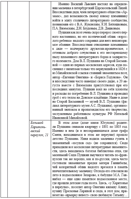 – сформировать у слушателей представление о роли московской литературной среды в становлении художественного мировоззрения писателя, о важности московского контекста в развитии творческого мышления А.С. Пушкина как поэта мирового значения;