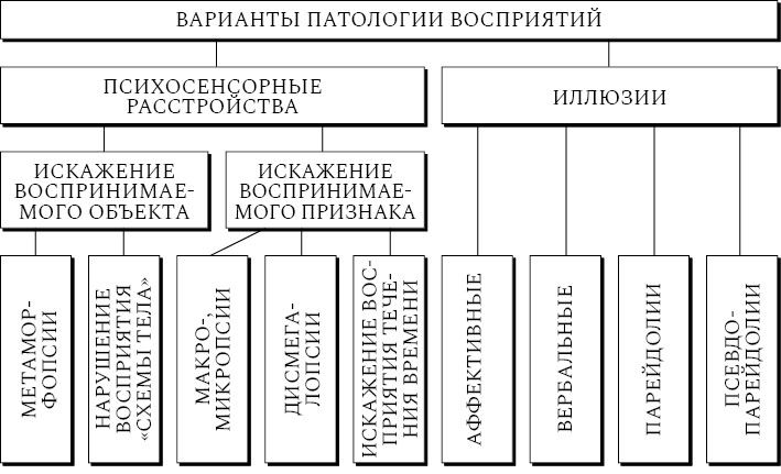 Характеризуя психосенсорные расстройства, следует отметить, что у больных всегда сохраняется критическое отношение к ним, они чужды личности и субъективно крайне неприятны. При нарушении восприятия схемы тела использование дополнительного анализатора может купировать симптом. Например, при кажущемся увеличении головы (парциальная макропсия) дотрагивание до нее (использование тактильного анализатора) или взгляд в зеркало (использование зрительного анализатора) могут восстановить патологически измененное восприятие.
