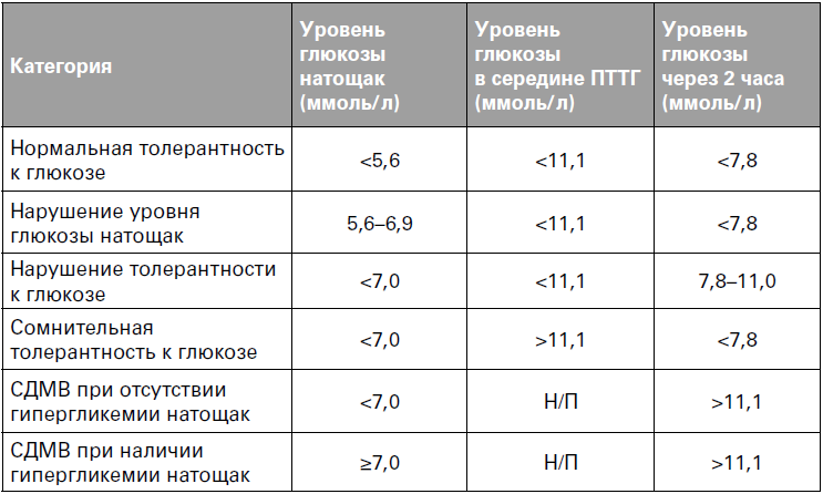 Таблица 1. Диагностические категории уровня глюкозы при определении с помощью двухчасового теста на толерантность к перорально введенной глюкозе