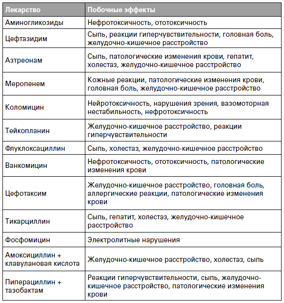 Таблица 1. Частые побочные эффекты вводимых внутривенно антибиотиков, применяемых при MB