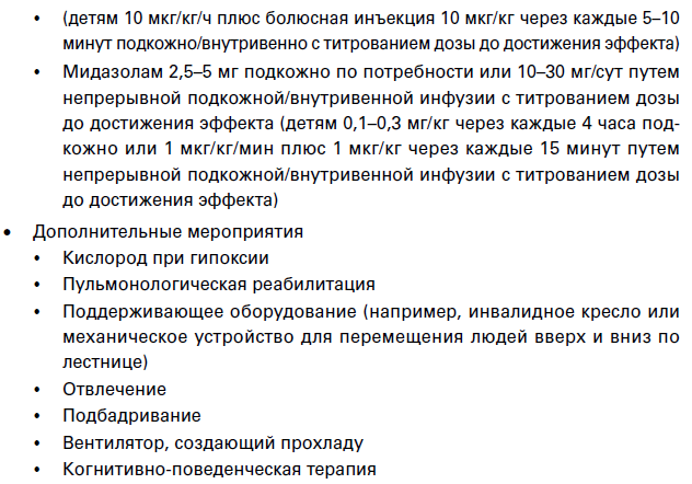 Одышка часто связана с тревогой в порочном круге, на этом фоне полезными могут быть методики когнитивно-поведенческой терапии или анксиолитики[530]. Кислород показан при гипоксии, но не приносит пользы пациентам, у которых наблюдается одышка без гипоксии[531].