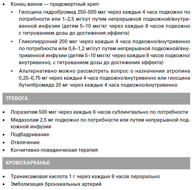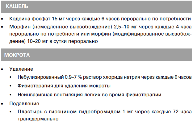 Таблица 1. Паллиативное лечение для ослабления симптомов с применением лекарственных средств (приведены некоторые лекарственные препараты, назначаемые при часто наблюдаемых симптомах, с указанием безопасных начальных доз, которые требуют титрования для достижения максимально возможного облегчения симптомов при минимальных нежелательных эффектах) и дополнительных мероприятий