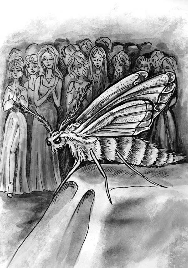 Внезапно «волынка» стихла, а барабаны зазвучали приглушённо, фоном. И тут же над яркой тряпицей на столе вспорхнули лёгкие, переливающиеся голубым крылышки. Возникшая из ниоткуда бабочка казалась волшебным, нет, даже божественным существом. По рядам прокатились восхищённые возгласы. Девушка начала медленно открывать глаза. В следующий момент громыхнули барабаны, и бабочка сорвалась с места. Подлетев к сидящей фигуре, она резко упала вниз и впилась острыми игольчатыми зубами в правое запястье девушки, до этого безвольно лежавшее на коленях. Раздались хлопки, барабаны застучали дробью, кожа на месте укуса побагровела, выпустив капельки крови, моментально сложившиеся в изображение. Спустя ещё несколько мгновений кровавый рисунок превратился в изящную татуировку, барабаны ударили в последний раз, и помещение погрузилось в полную темноту.