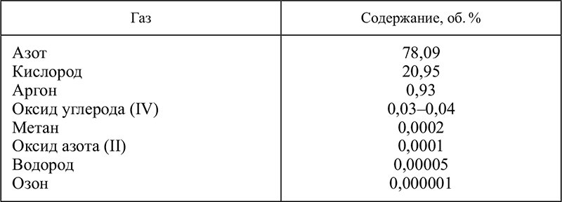 Атмосферный воздух состоит из азота, кислорода, оксида углерода (IV) и других газов (табл. 1.1). В атмосферном воздухе имеется также 3–5 мкг/м3 аммиака и до 4 % влаги.