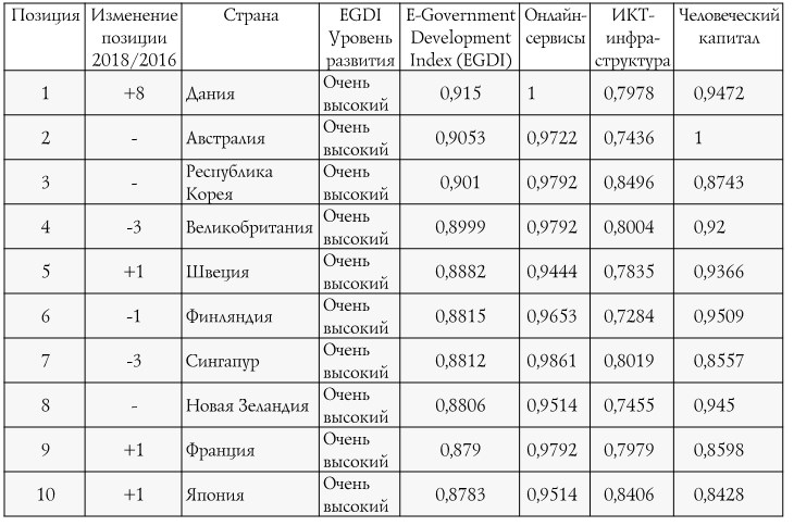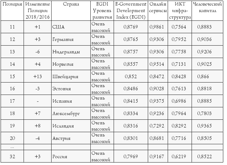 Как следует из представленных в таблице данных, впереди России (показатель EGDI составил 0,7969) в рейтинге находятся такие страны, как Испания (17-е), Германия (12-е), США (11-е), а возглавляет рейтинг Дания.