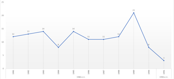 Число публикаций археологической тематики в иркутских газетах. 1981—1991 гг.