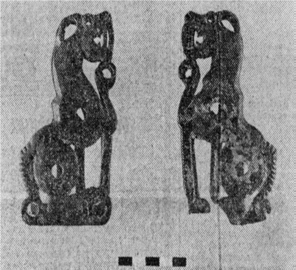 В этой связи особое внимание привлекает коллекция вылитых из бронзы предметов, поступивших в Иркутский областной краеведческий музей в канун 1981 года. Все находки происходят из клада, обнаруженного вблизи д. Корсуково Качугского района на берегу речки Жуя, левого притока Лены. Клад был найден трактористом совхоза им. Фрунзе П. К. Трифоновым во время, работ по раскорчевке леса. С глубины 20—25 сантиметров плугом был вывернут бронзовый котел, в котором, замазанные слоем глины, помещались 7 бронзовых изделий. К сожалению, один предмет вскоре был утерян. Из шести оставшихся – пять наверший и одна подвеска. Два навершия отлиты в виде сидящих на задних лапах оскалившихся хищников из семейства кошачьих (см. фото), еще два венчают реалистически выполненные полые скульптурки безрогих лосей с шариками внутри и, наконец, пятое – шар с прорезями на цилиндрической ножке. Особое место в коллекции занимает подвеска в виде изгибающегося дракона, на теле которого помещены две фигурки животных – лося и настигающего его хищника.
