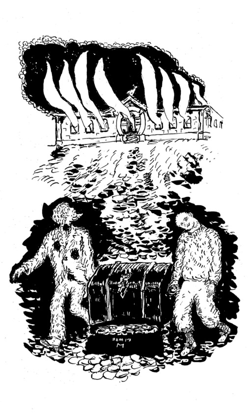 Сначала попыталось привидение Смагина уразуметь, что же, черт возьми, происходит в его сундуке, мудро полагая, что наскандалить всегда успеет. Теперь, после вторжения добавочного призрака, возникла неимоверная теснота. Башмак наглого пришельца упирался в голень, а прямо перед правым глазом торчало ухо, с противными волосками внутри. В вечной темноте сундука чужое ухо мерцало сине-зелёными как бы светлыми мазками, сквозь него смутно различалась коричневая цифра «20». Это просвечивала одна из двух тысяч ста шестидесяти семи керенок, ими неведомый идиот изнутри оклеил сундук. Пришлось бывшему хозяину особняка убивать время, в сундуке возлегая, вот он и ухитрился пересчитать сомнительные ассигнации. Нет, это же ни в какие ворота не лезет…