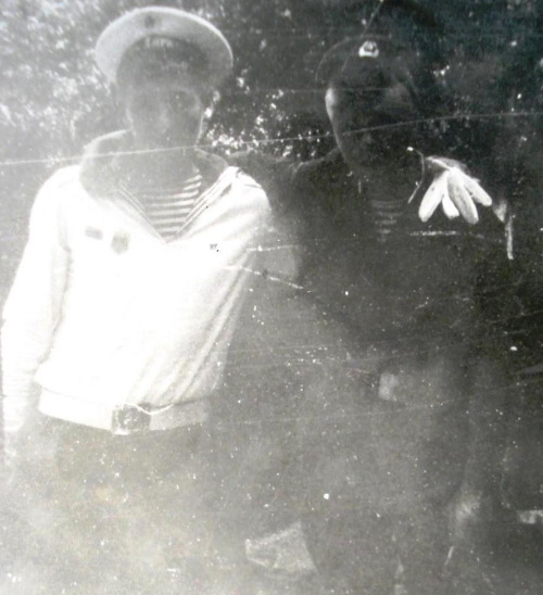 Видно только, что один в белоснежной морской форме с синим воротником (этот воротник на флоте называется, как флаг, поднимаемый на морских крепостях, гюйсом) и в лихо заломленной на затылок бескозырке.