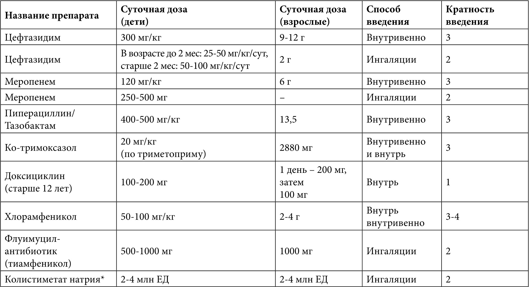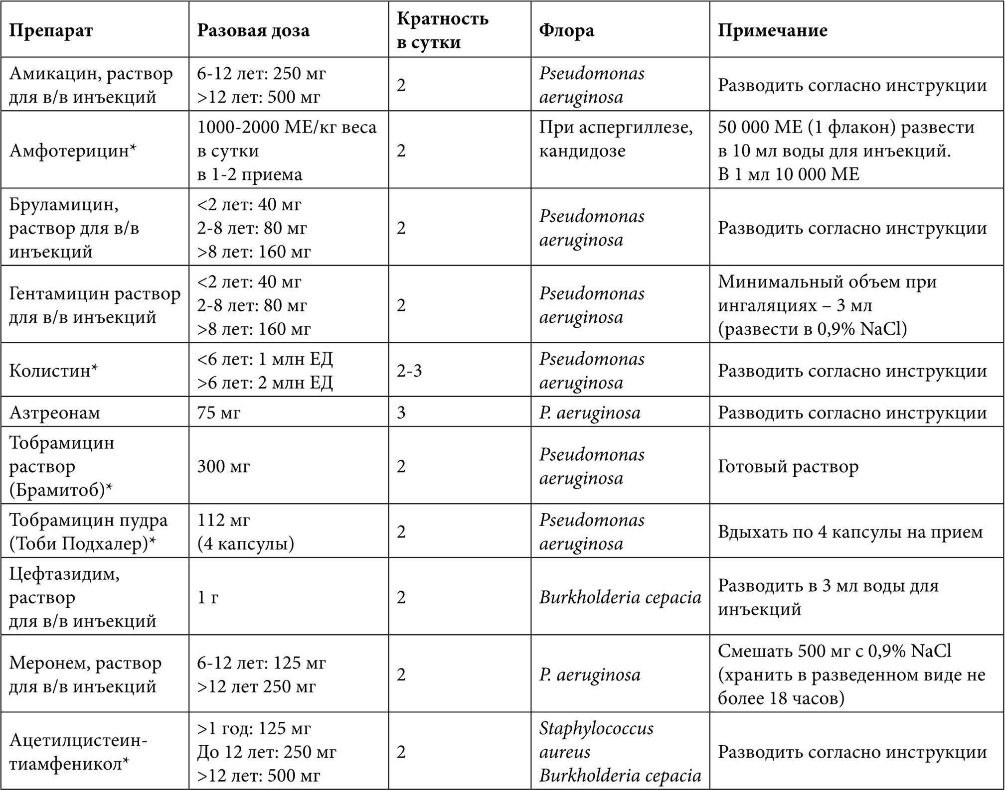 Для детей старше 12 лет и взрослых Европейским и Североамериканским консенсусами рекомендовано ингаляционное применение тобрамицина, меронема и цефтазидима, предназначенных для внутривенного использования (уровень доказательности низкий, класс рекомендаций – D) [81].