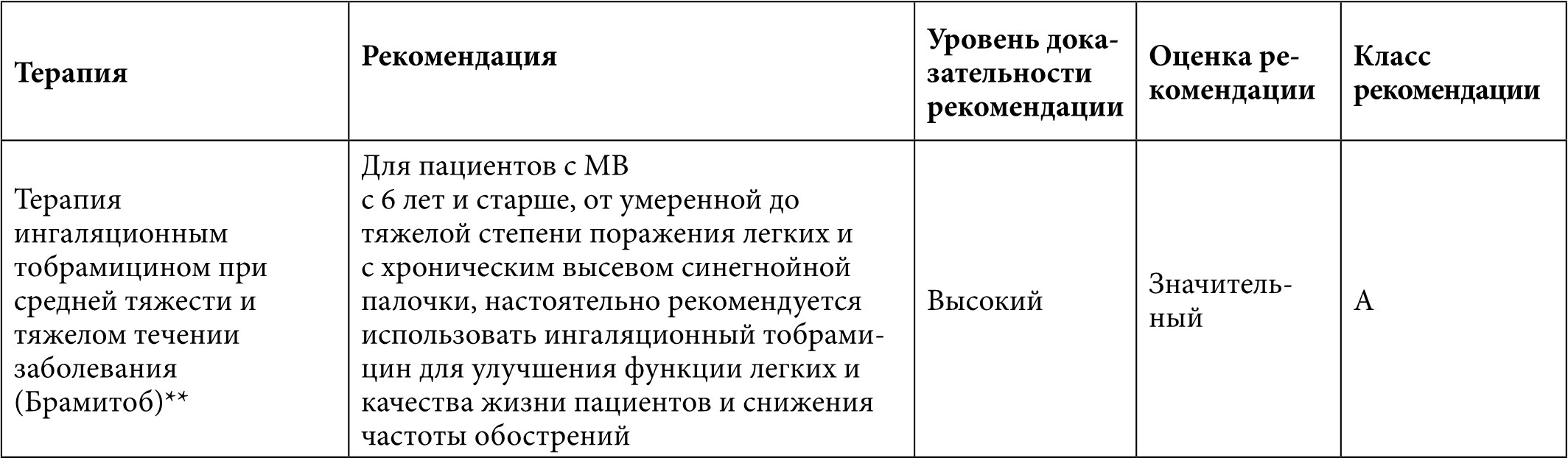 14. Ингаляционная терапия хронической инфекции дыхательного тракта при МВИнгаляционная терапия разработана для эрадикации (п. 10.4) и терапии хронической Pseudomonas aeruginosa-инфекции (п. 10.5 – контроль за инфекцией) [86]. При хронической инфекции используют тобрамицин в форме раствора для ингаляций (Брамитоб, 300 мг) или в форме порошка (Тоби Подхалер, 112 мг) дважды в сутки интермиттирующими курсами: 28 дней приема, 28 дней перерыва, всего 6 курсов в год (уровень доказательности рекомендаций – высокий, класс рекомендаций – А) или раствор колистиметата натрия (Колистин) 2-4 млн ЕД в сутки постоянно. Азтреонам (Cayston Aztreonam lysine производства Corus Pharma, Inc.) – антибактериальный ингаляционный препарат для лечения инфекции, вызванной Pseudomonas aeruginosa, при муковисцидозе. В РФ назначается индивидуально при непереносимости тобрамицина и колистина или резистентности к ним. Суточная доза – 75 мг 3 раза в день, всего 225 мг в день. Потребность в год: 6 курсов по 28 дней. При отсутствии данных препаратов возможно временное использование растворов для внутривенного применения ингаляционно: гентамицина, амикацина или бруламицина (Табл. 6). При микозах возможно применение амфотерицина, при Staphylococcus aureus и Burkholderia cepacia complex – флуимуцила или антибактериальных препаратов для внутривенного введения (на основании зарубежных консенсусов и российского опыта) (Табл. 7). Однако в настоящее время нет доказательных исследований по их применению [20]. Характеристика доказательности рекомендаций рассматривалась нами согласно общепринятой методике (Табл. 8).