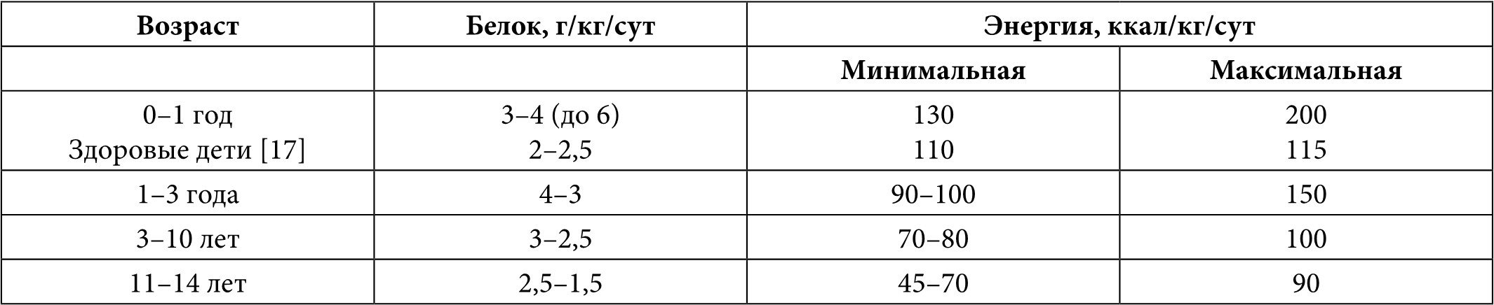 Таблица 1. Рекомендуемые величины потребления белка и энергии для детей с муковисцидозом [16]