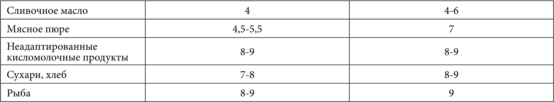 ПрикормПрикорм вводится, в соответствии с рекомендациями WHO/ESPGHAN, в возрасте от 4 до 6 месяцев. Некоторым детям с МВ по индивидуальным показаниям прикорм может быть введен и раньше при низкой прибавке в массе. Первыми блюдами прикорма должны быть энергетически плотные блюда: каши на сцеженном молоке или молочной смеси со сливочным маслом, творог 4,5–5% жирности, далее вводят овощное пюре с мясным пюре и яичный желток. В рекомендациях по питанию младенцев с МВ (США) первым прикормом является мясное пюре ввиду богатого содержания белка и цинка [26]. Следует использовать высококалорийные продукты прикорма, обогащенные витаминно-минеральным комплексом: детские молочные каши промышленного производства с добавлением сливочного масла, овощные пюре с добавлением растительного масла, мяса. Коровье молоко можно использовать только для приготовления блюд в ограниченном количестве с 8–9 месяцев. В эти же сроки вводят неадаптированные кисломолочные продукты (детский кефир, натуральный йогурт), обогащенные живыми бифидо- и лактобактериями (Табл. 3). Фруктовое пюре ввиду невысокой калорийности рекомендуется вводить во втором полугодии, уже после того как ребенок получил молочную кашу, творог и овощи с мясом. Фруктовые соки вводят после 7-8 месяцев в ограниченном количестве (10 мл на каждый месяц жизни в день), дают только после основных приемов пищи (в качестве десерта). Следует помнить, что прием соков между едой может снизить аппетит ребенка и он откажется от основной еды (молока, каши или мяса). Ни в коем случае нельзя заменять соками основной прием пищи!