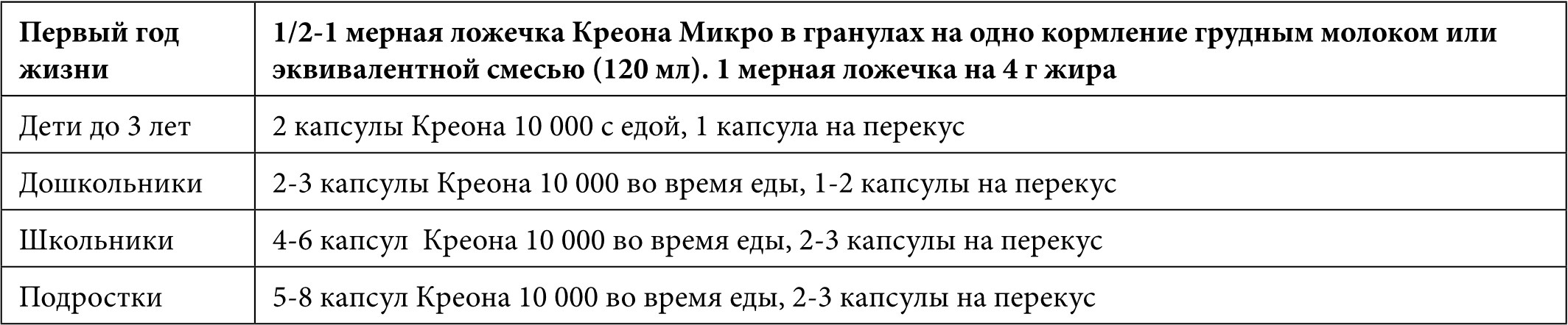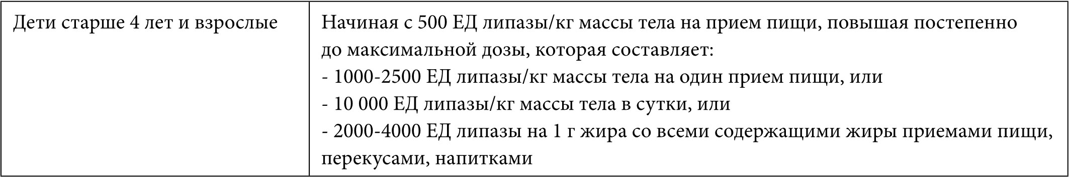 • После введения в рацион твердой пищи индивидуально титровать дозу ферментов в соответствии с содержанием жира в пище. Для достижения максимального эффекта необходимы регулярные консультации диетолога