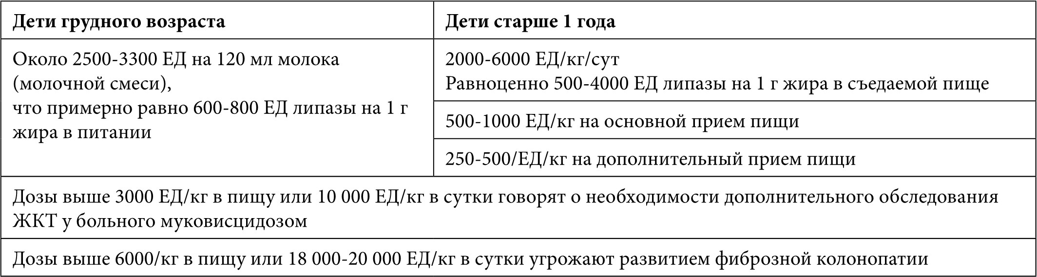Недавнее международное исследование выявило, что, несмотря на общепринятые Европейские рекомендации, средние дозы панкреатических ферментов (от 3,947 до 13,615 ЕД липазы/кг и выше), принимаемых больными муковисцидозом в разных странах, значительно различаются, что еще раз подчеркивает необходимость индивидуального подхода к подбору заместительной ферментной терапии [26].