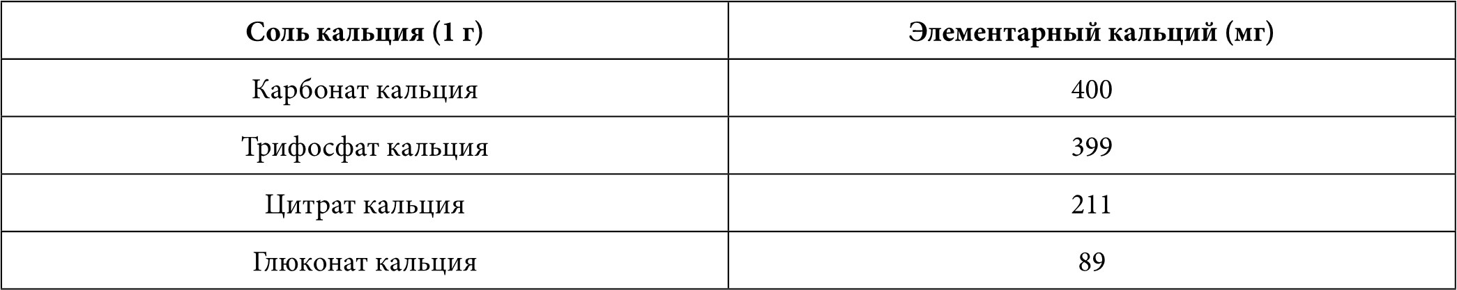 Таблица 4. Количество элементарного кальция в его солях [23]