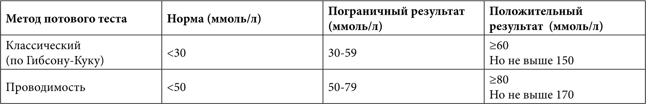 В качестве нормальных показателей рекомендуется учитывать уровни хлоридов (проба по Гибсону-Куку), не превышающие <30 ммоль/л, и показатели проводимости <50 ммоль/л. Положительными в отношении муковисцидоза являются уровень хлоридов >60 ммоль/л и проводимость пота >80 ммоль/л (Табл. 1) [9, 5, 17, 18, 23].