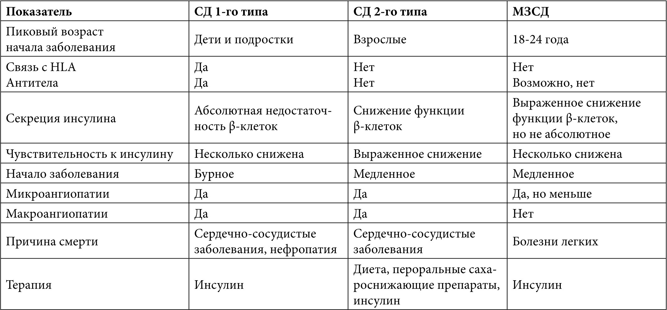 МЗСД имеет черты как СД 1-го типа, так и СД 2-го типа, но определенно отличается от них, что обусловливает уникальный подход к диагностике и лечению заболевания [1] (Табл. 1).