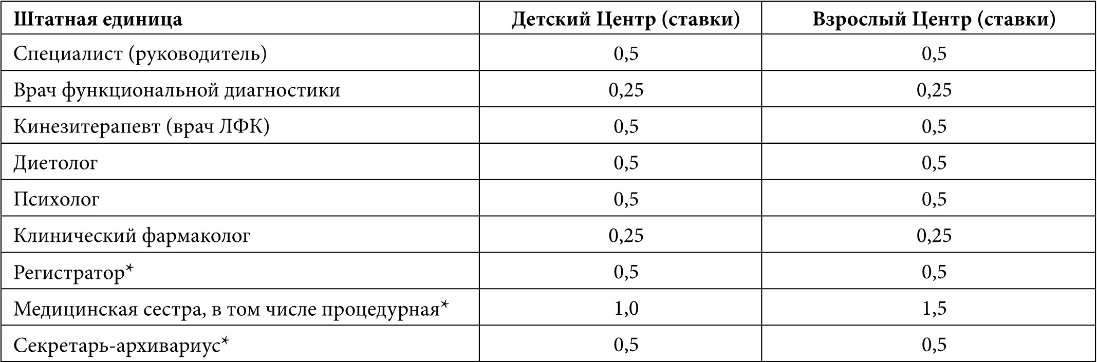 Штат: руководитель Центра – 0,5-1 ст. и врач-педиатр/терапевт – 0,5-1 ст.; врач функциональной диагностики – 0,25-0,5 ст., кинезитерапевт – 0,5-1 ст., диетолог – 0,5-1 ст., психолог – 0,5-1 ст., клинический фармаколог – 0,25-0,5 ст. (штат определяется количеством больных в Центре) медицинская сестра – 2-3 ст., регистратор – 1 ст. и секретарь – 1 ст. Должны быть организованы консультации гастроэнтеролога, ЛОР-врача, эндокринолога, аллерголога, трансплантолога, генетика, кардиолога, гинеколога, репродуктолога (0,25-0,5 ставки в зависимости от количества больных в центре).