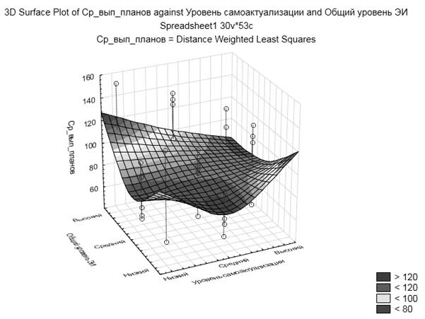 Рис. 1. Зависимость среднего выполнения планов в сфере продаж от общего уровня эмоционально интеллекта и уровня самоактуализации