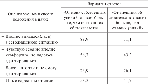 Оценка учеными своего положения в науке представлена в табл. 2. Особого внимания заслуживают ученые пенсионного возраста, они составляют ядро современных российских научных кадров. По данным экспертных оценок, позиции и роли ученых старших возрастов неоднозначны. Примерно половина академических ученых этих возрастных групп активно борется за гранты и ведет фундаментальные исследования, другая половина ожидает перемен, изменения отношения государства к науке, надеется на увеличение госбюджетного финансирования.
