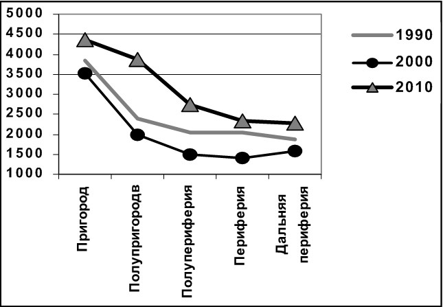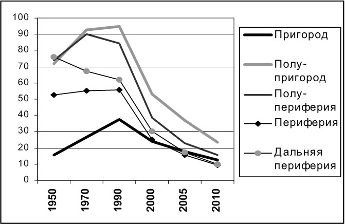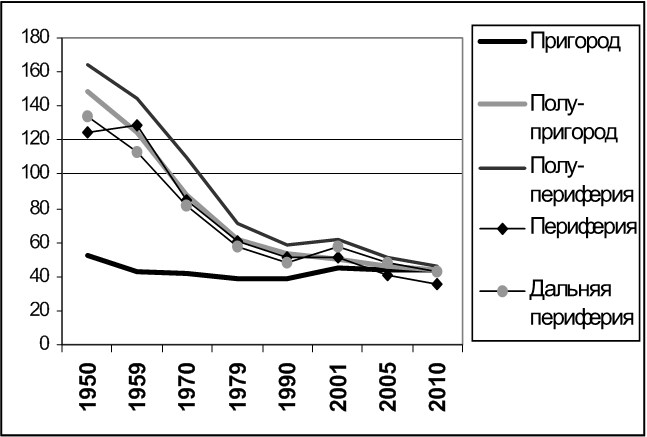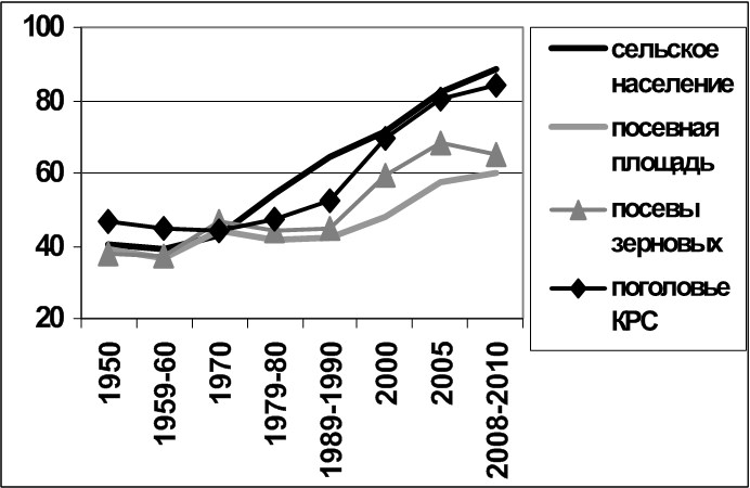 Градиенты перепадов плотности населения достигают 10 раз и сложились задолго до 1990 г., усилившись в последние десятилетия. При такой убыли сельского населения посевную площадь до 1990 г. пытались расширять даже на периферии. Но поголовье скота кроме пригородов и полупригородов начало уменьшаться при социализме (рис. 2).