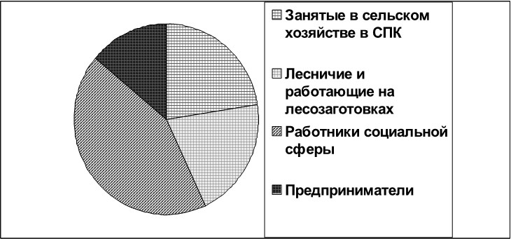 Однако для тех, кто работает, условия жизни в деревне также сложны. Половина всех занятых – это социальная сфера (администрация, школа, клуб, библиотека и т.п.), зарплата там колебалась в 2011 г. от 2,5 до 7– 8 тыс. руб. У школьных учителей она зависит от нагрузки (которая невелика при 24 учениках средней школы), категории, надбавок. В сельскохозяйственном кооперативе формально заняты 13 человек (рис. 6.). Но фактически на поле работал сам председатель и 2–3 надежных работника. Еще есть доярки на оставшихся несколько десятков голов скота. В пастухи обычно идут менее надежные пьющие работники, а скот часто разбредается по окрестным деревням, поедая заготовленное сено и овощи на огородах. Заработки в СПК составляют от 3 до 7 тыс. руб., часто деньги выплачиваются с задержкой. Чуть лучше заработки у «тружеников леса», особенно в период заготовок древесины. А самые стабильные деньги – у пенсионеров (7–8 тыс. руб., иногда более). Многие безработные, не имеющие шансов когда-либо получить работу, годами живут на пенсии стариков. Но есть среди формально безработных и работящие мужики, которые из-за низких зарплат предпочитают подрабатывать сдельно летом у дачников и собирать на продажу ягоды, в остальное время часть из них на отходе. Местные предприниматели – это собственники магазина, ларька, автолавки. И еще пять человек взяли ссуду на развитие личного сельского хозяйства (на все поселение осталось пять коров в частном секторе, есть несколько поросят; двое держат кроликов). Это костяк людей, готовых и умеющих работать.