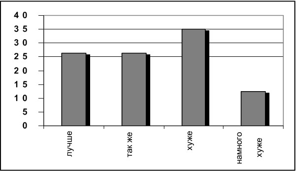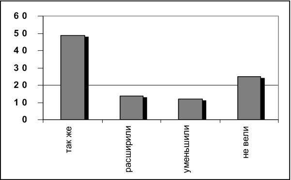 Опросы и данные местной администрации показали, что переход населения к частному хозяйству даже при кризисе колхозов в таких районах проблематичен. Большинство населения уменьшило производство продукции в своем хозяйстве (рис. 7). Три фермерских хозяйства на весь Мантуровский район организованы приезжими. Товарность же местных личных хозяйств населения очень низка. Лишь 14% домохозяйств готовы к товарному производству, если им оказать ту или иную помощь (рис. 8). Надежды на переход в нечерноземной глубинке от крупных предприятий к мелким оказались иллюзией (даже при поддержке государства, которая в настоящее время недостаточна). Местное население не продуцирует из своей среды мелких предпринимателей в сельском хозяйстве (редкие предприниматели, в основном, в торговле) и настороженно относится к приезжим. Но считает, что жить стали хуже, лишь половина опрошенных (рис. 9). Четверть домохозяйств даже нашли преимущества в новых условиях; обычно это те, кто работает на дачников, или пенсионеры, чьи дети оказались успешны в городах.