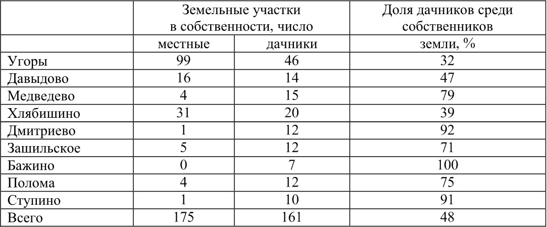 Помимо местных жителей, в Угорском и Леонтьевском сельских поселениях опрашивались и все наличные на тот момент (август 2008 г.) городские дачники, составляющие в разных деревнях от 30 до 90% собственников домохозяйств (см. табл.). Несмотря на удаленность от Москвы, дачники есть во всех живых деревнях. Чем меньше местных жителей в деревне, тем больше доля домов, купленных горожанами. Есть опустевшие деревни. Там тоже прежде были дачники. Но когда не осталось местных жителей, дома зимой начали полностью разорять и разбирать по частям. Жизнь дачников без местных жителей в таких удаленных местах невозможна, эти два сообщества тесно связаны и зависимы друг от друга.
