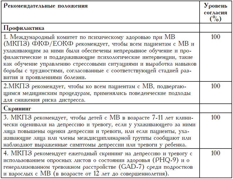В международных центрах по лечению MB использовалось более 48 различных средств скрининга[44]. С целью стандартизации процесса скрининга посредством использования надежных и валидных мероприятий, дающих клинически значимые оценки, комитет рекомендует использовать Опросный лист о здоровье пациентов[45] (PHQ-9), который содержит раздел для оценки риска суицида, и состоящую из 7 пунктов шкалу генерализованного тревожного расстройства (GAD-7) для ежегодного скрининга подростков (в возрасте 12 лет и старше) и взрослых с MB и ежегодно предлагать скрининг, по меньшей мере, одному лицу, осуществляющему первичный уход за ребенком с MB (в возрасте от О до 17 лет). Опросные листы PHQ-9 и GAD-7 являются доступными, краткими, надежными и валидными, содержат оптимальные пограничные оценки для обнаружения психологических симптомов, соответствуют современным диагностическим критериям Руководства по диагностике и статистике психических расстройств, 5-е издание (DSM-5)[46] и переведены на все основные языки.