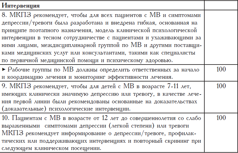 ► МКПЗ рекомендует, чтобы в случае, если ежегодный скрининг демонстрирует высокий уровень депрессии и тревоги, были выполнены клинические диагностические процедуры, при необходимости, в сочетании с доказательными психологическими и/или фармакологическими интервенциями.