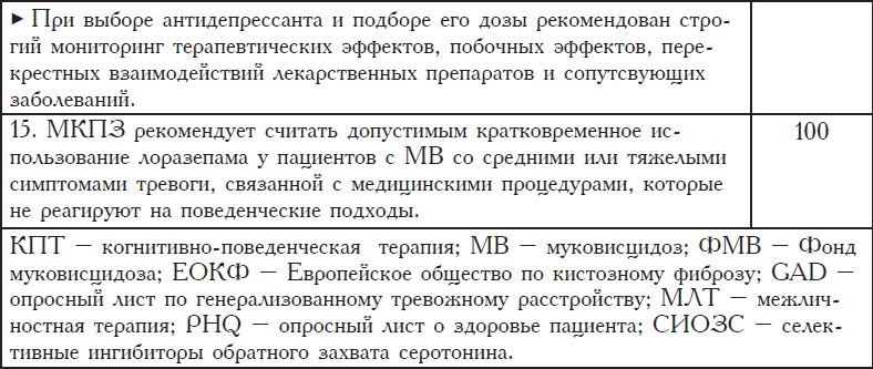 В исследованиях, посвященных измерению психологического дистресса у пациентов с муковисцидозом (MB), были обнаружены высокие уровни депрессии и тревоги. Психологические симптомы у пациентов с MB и ухаживающих за ними родителей были связаны со сниженной функцией легких, сниженным индексом массы тела, менее выраженной приверженностью к лечению, низким качеством жизни, связанным со здоровьем, более частыми госпитализациями и повышенными расходами на медицинские услуги. Для выявления и лечения депрессии и тревоги при MB Фонд КФ и Европейское общество по КФ предложили группе экспертов, включавшей врачей, физиологов, психиатров, медицинских сестер, социальных работников, фармацевтов, родственников и людей с MB, разработать совместные рекомендации по клинической помощи. Через 18 месяцев этот комитет, состоявший из 22 членов, был разделен на четыре рабочие группы – Скрининг; Психологические интервенции; Фармакологическое лечение; Реализация и дальнейшие исследования – и использовал методологию, включавшую популяционный, интервенционный, сравнительный методы и метод оценки исходов (PICO), для постановки вопросов для поиска и анализа литературных источников. Поиск был проведен в поисковых системах PubMed, PsychlNFO, ScienceDirect, Google Scholar, Psychiatry online и ABDATA методологом из Дартмута. Комитет проанализировал 344 статьи, разработал основные положения и установил 80 %-ный уровень одобрения для каждого положения рекомендаций в качестве порогового уровня согласия перед процедурой анонимного голосования. Пятнадцать положений руководящих указаний по скринингу и лечению депрессии и тревоги у пациентов с MB и ухаживающих за ними родителей были утверждены посредством голосования. Поскольку эти рекомендации реализуются в центрах MB различных стран, их осуществление и обеспечение ресурсами следует тщательно контролировать с целью оценки затруднений и проблем, валидности и использования.