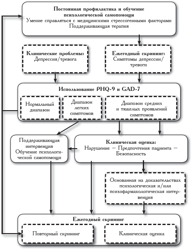 Руководящие документы рекомендуют использование опросного листа PHQ-9, если доступны соответствующие диагностические, лечебные и обеспечивающие последующее наблюдение.[47][48][49][50] Опросный лист PHQ-9 также рекомендован для оценки тяжести депрессии[51]. При скрининге на тревогу общества Соединенного Королевства рекомендуют использовать GAD-7[52]. Рисунок 1 демонстрирует мета-стратегию скрининга и лечения депрессии и тревоги. Рекомендуется провести краткое разъяснение и обсуждение логического обоснования скрининга проблем с психическим здоровьем со всеми пациентами и ухаживающими за ними родителями, с последующим использованием опросных листов PHQ-9 и GAD-7 (http://phqscreeners.com/). В случае людей, осуществляющих уход, центры, которые не имеют ресурсов или опыта для оценки суицидальности, могут исключить из PHQ-9 вопрос, который оценивает самоповреждение, и использовать PHQ-8. Альтернативный подход состоит в использовании двух пунктов из PHQ-9 о подавленном настроении и ангедонии (PHQ-2, http://www.cqaimh.org/pdf/) и двух пунктов из GAD-7 об ощущении тревоги/нервозности и неспособности прекратить или контролировать беспокойство (GAD-2, http://depression.acponline.org/content/all/tools/dcg_oll.pdf). См. рекомендации 4 и 5 в таблице 1.