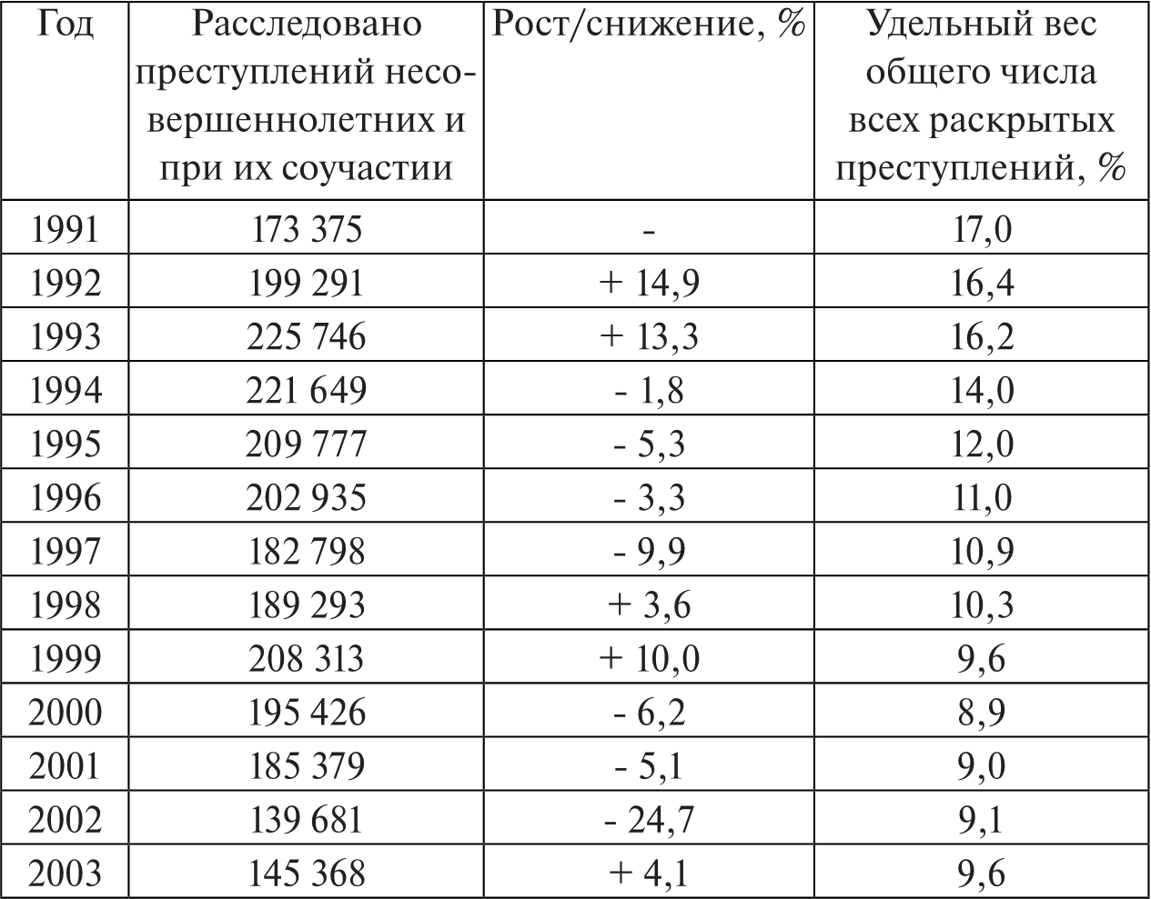 За последние годы существенно возросло количество и удельный вес насильственных преступлений (убийств, изнасилований, случаев причинения тяжкого вреда здоровью, средней тяжести вреда здоровью, хулиганств, грабежей, разбоев), а также таких, отличающихся сложностью механизма совершения преступлений, как преступления экономической направленности и мошенничество; весьма заметен и рост показателей регистрации таких опасных преступлений, как умышленное уничтожение имущества, угон транспортных средств, незаконное ношение, хранение оружия. В то же время традиционные для несовершеннолетних кражи и преступления, связанные с наркотиками, идут на убыль.