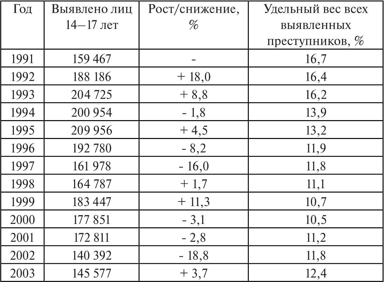 Так, только за четыре года (с 2010 г. по 2014 г.) численность населения России в возрасте от 14 до 17 лет сократилась на 11,9 % (с 5 976 548 до 5 267 535), что закономерным образом отразилось и на показателях подростковой преступности.