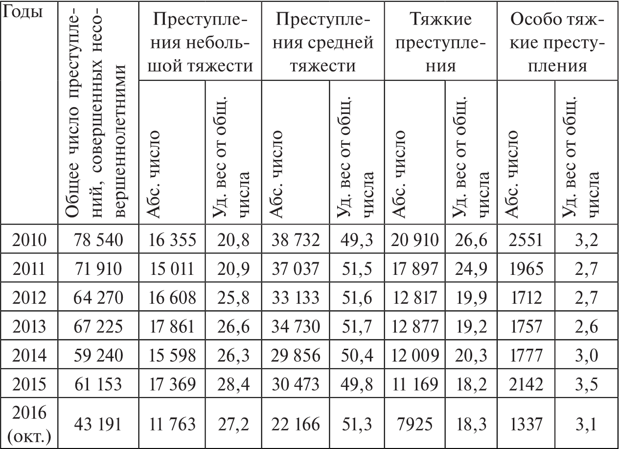 В 2015 г. каждое двадцатое расследованное преступление совершено несовершеннолетними или при их соучастии. По сравнению с 2014 г. число таких преступлений увеличилось на 3,2 % и составило 61 153 (в 2014 г. – 59 240, в 2013 г. – 67 225, в 2012 г. – 64 270). Наметилась устойчивая тенденция ухудшения качественных характеристик преступности несовершеннолетних. При этом в последние годы наметилась тенденция роста числа особо тяжких преступлений, совершенных несовершеннолетними, что свидетельствует о сохранении высокой степени общественной опасности преступности несовершеннолетних: в 2012 г. – 1712, в 2013 г. – 1757 (+2,6 %), в 2014 г. – 1777 (+1,1 %), в 2015 г. – 2 142 (+20,5 %), за четыре прирост составил 21,9 %.